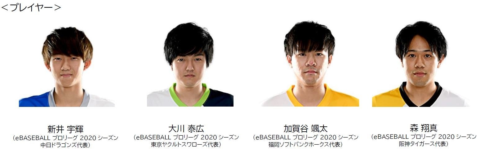 本大会では「パワフルプロ野球」シリーズを競技タイトルとして開催していたプロ野球eスポーツリーグ「eBASEBALLプロリーグ」2020シーズンで活躍したプレイヤーとプロ野球OBの1名ずつがタッグを組んで試合に挑みます。プレイヤーは新井 宇輝選手、大川 泰広選手、加賀谷 颯太選手、森 翔真選手の4名、プロ野球OBは礒部 公一氏、佐伯 貴弘氏、多村 仁志氏、林 昌範氏の4名が参戦します。