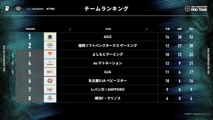 ■1st Season終了時点のチームポイントランキング