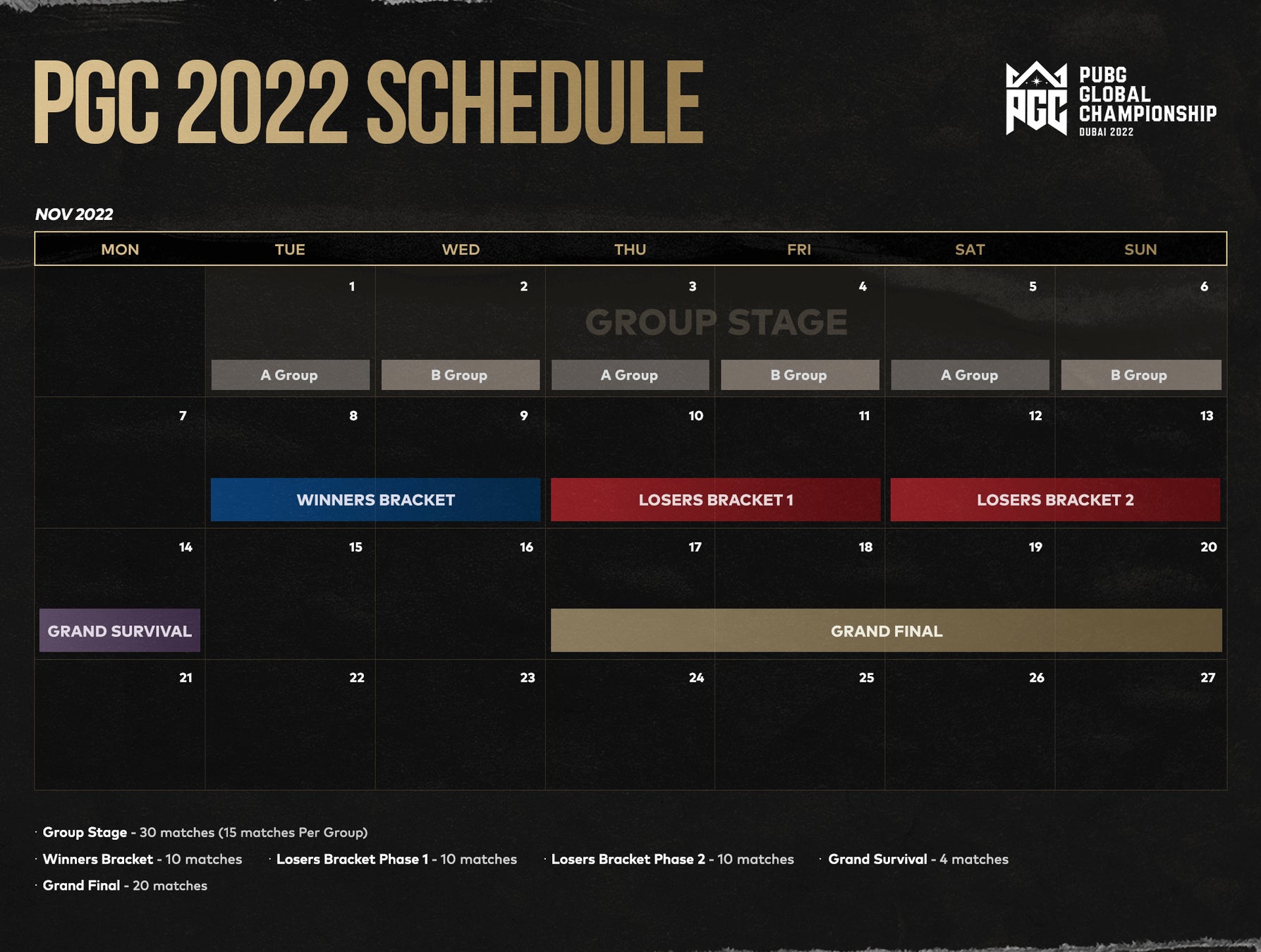 PGC 2022は11月1日(火)から11月20日(日)まで開催され、アメリカ、ヨーロッパ、アジア、APACのチームが賞金獲得のために毎週会場で競い合います。大会はアラブ首長国連邦のDubai Exhibition Centreで開催され、Twitch、YouTubeチャンネルでPUBG: BATTLEGROUNDSの模様が生配信される予定です。詳しい日程と各ステージの詳細は下記をご覧ください。